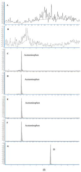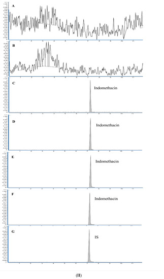 (I) Selected ion chromatograms of (A) solvent blank (B) plasma blank (C) LLOQ (1 ng/mL) (D) LQC (3 ng/mL) (E) MQC (300 ng/mL) (F) HQC (600 ng/mL) of acetaminophen (206 min) and (G) indomethacin (50 ng/mL) as I.S. (7.2 min). (II) Selected ion chromatograms of (A) solvent blank (B) plasma blank (C) LLOQ (1 ng/mL) (D) LQC (3 ng/mL) (E) MQC (250 ng/mL) (F) HQC (400 ng/mL) of Indomethacin (7.2 min) and (G) diclofenac sodium (50 ng/mL) as I.S. (7.1 min).