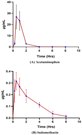 Pharmacokinetic profiles of (A) acetaminophen and (B) indomethacin.
