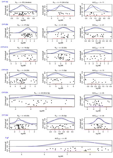 Distribution of phenotyping indices for “normal” activities obtained from the literature analysis. Distributions of patients’ MRs and f-AUC0–6h (black dots) are presented in logarithmic scale. In black: the estimation of distribution function by the kernel estimator. In blue: the probability density of the estimated Gaussian. In red: the 95%,95% tolerance interval obtained from the literature (for CYP2D6, IM in purple and EM in red; for P-gp, AUC0–6h for fexofenadine in the Geneva cocktail in red and AUC0–6h for fexofenadine alone in orange; for CYP 2B6 and CYP 2C9 t2h, the interval from Geneva studies in red). SA: best time to predict AUC MR, according to sensitivity analysis. Sp: highest Spearman correlation coefficient with AUC MR. Literature: time to predict AUC MR in literature.