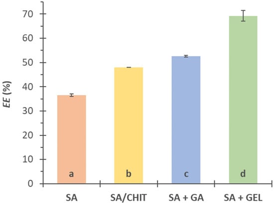 Encapsulation efficiency (EE, %) of phenol-rich grape pomace extracts using various coatings (3% w/v sodium alginate, SA; combination SA with 1.5% chitosan, SA/CHIT; SA with 1.6% w/v gum arabic, SA + GA; and SA with 5% w/v gelatin, SA + GEL). Different letters represent significant differences (ANOVA, Duncan’s test at p < 0.05).