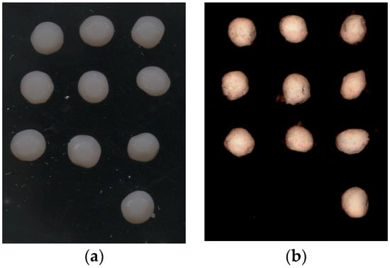 The geometric characteristics (size and shape) of hydrogels and dry microbeads were studied by computer image analysis. The EPSON V500 Photo Scanner (Epson America Inc., Long Beach, CA, USA) was used to capture and digitize the samples with a resolution of 800 dpi, color depth of 24 bits in sRGB model, and format TIFF. Exactly 10 hydrogels/dry microbeads were stacked on a glass Petri dish, taking care that they did not touch each other. Then, the Petri dish containing the samples was placed on the scanner, which was located in a dark chamber to eliminate the influence of external light and reduce the possibility of errors during scanning. After scanning, the images were processed using the ImageJ program (version 1.59g, Wayne Rasband, NIMH, Bethesda, MD, USA). Parameters divided into two groups were read-parameters of size (area, perimeter, max and min Feret diameter) and shape (circularity, roundness, solidity). The results of the measurement of the size of the samples were converted from pixels to millimeters, taking into account the known values of the scanner resolution in dpi units. The shape parameters provide information on how much the shape of the analyzed sample deviates from a regular circle. The values range from 0 to 1, where 1 indicates the value of a perfect circle (Table 1).