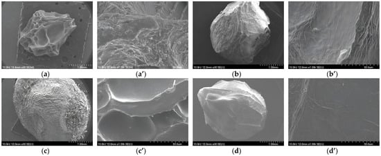 It can be seen from Table 6 that the hardness of the hydrogels changed significantly after freeze-drying. The largest change is seen in SA microbeads, where the hardness increased by 88.31%, and the smallest change is seen in SA/CHIT microbeads compared to hydrogels (24.07%). It is also evident that SA hydrogels had the highest hardness (0.398 N) and that the addition of other coatings decreased the hardness, which is consistent with the results of Zamora-Vega et al. [87] and Sandoval Mosqueda et al. [88]. The addition of other coatings led to softer hydrogels, and the strength was reduced because there was no strong molecular interaction between the constituents in the hydrogels.