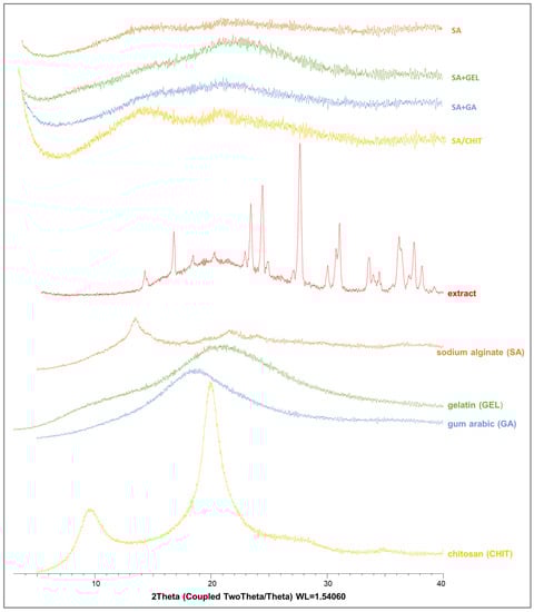 The crystalline structure of the extract, coatings and freeze-dried microparticles, was characterized using an X-ray powder diffraction system (BRUKER D8 Advance diffractometer, Karlsruhe, Germany). The samples were measured with Cu Kα radiation (λ = 1.5406 Å) and scanned at 40 kV and 40 mA in the interval of 3–40 2θ with a VÅNTEC-1 detector. The further evaluation of results, smoothing, Kα2-stripping, and background removal were performed using DIFFRAC plus EVA software (Karlsruhe, Germany). Prior to the measurement, freeze-dried microbeads were pulverized using a mortar and pestle.