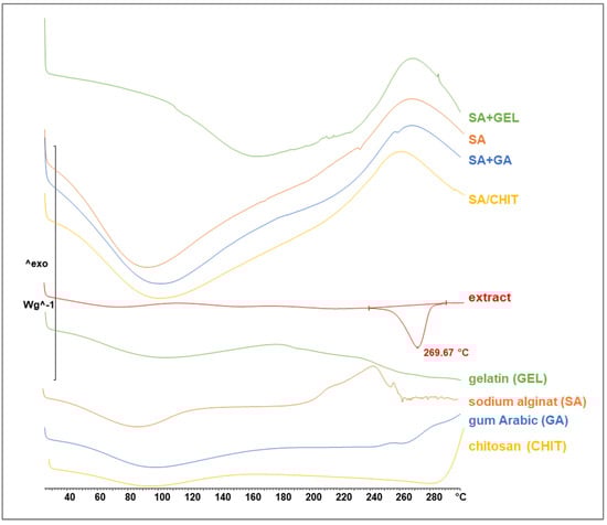 To evaluate the thermal behavior of produced microbeads, extracts, and coatings, differential scanning calorimetry (Mettler Toledo 821e DSC; Mettler Inc., Schwerzenbach, Switzerland) was applied. Approximately 3–5 mg of the samples was measured in the temperature interval of 25–300 °C at a heating rate of 10 °C/min, under a constant argon flow of 150 mL/min.