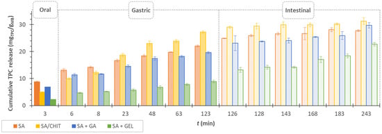 Briefly, the release consisted of three phases: oral, gastric, and intestinal. Electrolyte solutions mimicking those of the human gastrointestinal tract were used for each of these phases, with release occurring without the use of enzymes. A temperature of 37 °C was maintained throughout the process (243 min in total) and stirring was performed with a magnetic stirrer. To the dry microbeads (100 mg), 4 mL of simulated salivary fluid (SSF) and 25 μL of CaCl2 (H2O)2 were added. The pH was then adjusted to 7, and redistilled water was added to a total volume of 10 mL. After 3 min, 2 mL of the sample was removed for further analysis of the phenolic compound content, and 2 mL of the SSF solution was returned to the system. After a three-minute oral phase, the gastric phase was initiated by adding 8 mL of simulated gastric fluid (SGF) and 5 μL of CaCl2 (H2O)2. The pH was then adjusted to 3 with 1 M of HCl to fully simulate the acidic conditions prevailing in the stomach. After reaching the desired pH, water was added to a total volume of 20 mL. This phase lasted for 120 min, during which aliquots of the sample were taken at specific time intervals and the same volume of simulated intestinal fluid (SGF) was returned to the system, as described in the oral phase. At the end, 16 mL of the SIF solution and 40 μL CaCl2 (H2O)2 were added. The pH was then adjusted to 7 and redistilled water added to a final volume of 40 mL. The sampling procedure was the same as for the previous two phases, except that the SIF solution was returned to the system. This phase also lasted 120 min.