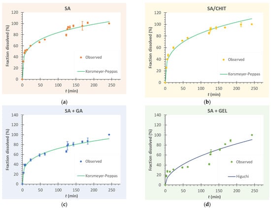 The coatings used in encapsulation affect many properties of the particles produced, such as geometrical parameters, texture, and surface morphology, and these properties also play a role in the in vitro release behavior of the encapsulated compounds [25,26]. The release of encapsulated bioactive compounds from prepared particles should be controlled, i.e., the release should occur at the target site where the biological properties of the compounds can be achieved [17]. Knowledge of the release kinetics is important for bioactive compound delivery systems, and various mathematical models have been developed to describe and simulate the release process of bioactive compounds in drug delivery systems or food delivery systems [27]. Four main mechanisms may play a role in the release of bioactive compounds from encapsulated particles, including dissolution, diffusion, swelling, and erosion [28]. Furthermore, mathematical modeling plays an important role in predicting the release rate and release profile of bioactive compounds while reducing the number of experiments required [27].
