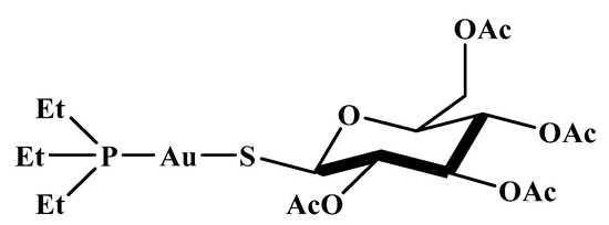 Auranofin (AF, 1-thio-β-D-glucopyranosatotriethylphosphine gold-2,3,4,6-tetraacetate) was the first orally administered gold-based metallodrug developed specifically to remedy rheumatoid arthritis, certified by the US Food and Drug Administration (FDA) in 1985 (Figure 2) [16]. Its therapeutic effect is ascribed to the [AuPEt3]+ cation yielded after the detachment of the thiosugar in the biological milieu [17]. This cation has an augmented preference to thiol- and selenol-based proteins [18], thus causing the disruption of cellular metabolism pathways and leading to the intended medicinal impacts.