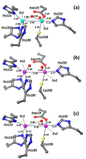 Figure 3. X-ray structures of the active site of NDM-1 with (a) Zn, (b,c) Au atoms. X-ray structures with Au2 coordinated to a water molecule ((b), chain A at PDB 6lhe) and without a water molecule in the first coordination sphere ((c), chain B at PDB 6lhe). Zn1/Au1 is always displayed at the left, and Zn2/Au2 is displayed at the right. The numeration of protein residues is taken from corresponding PDBs. All the distances are in Å and typed in italic font. The PDB codes for the represented structures are 5zgz [12] and 6lhe [15]. Color scheme employed in this figure and in other figures below: Zn (cyan), Au (plum), S (yellow), O (red), N (blue), C (grey), H (white).