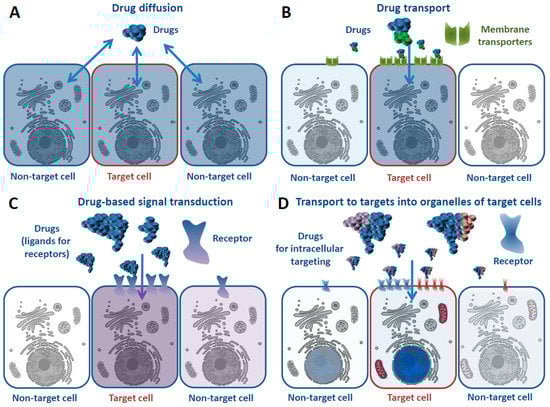The effect of the vast majority of drugs is ultimately realized inside the cell due to their interaction with biomacromolecules. All drugs that have an effect on intracellular processes can be roughly divided into four main groups (Figure 1). Traditional low molecular weight medications, most of which are subject to the rules formulated more than 20 years ago by Lipinski et al. [], can be attributed to the first group (Figure 1A). These substances are capable of nonspecific diffusion through the plasma membrane and exert their effect on the metabolic and regulatory processes within cells. Therefore, the distribution of such drugs is generally independent of the cell type. For various drugs and a number of disorders, the lack of cell specificity is not crucial; however, for the treatment of many diseases, it creates fundamental problems. These include, first of all, oncological diseases, in the treatment of which highly toxic antitumor drugs are used.