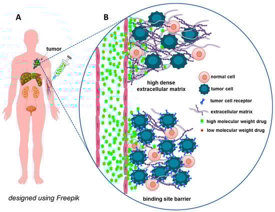 The extracellular matrix, with a network of fibrillar proteins and negatively charged proteoglycans, may be another barrier on the way of some macromolecules to target cells that are not exposed to the bloodstream [,]. The extracellular matrix traps both positively charged and negatively charged macromolecules, so uncharged hydrophilic molecules have an advantage in overcoming this barrier [,]. Cells are connected to the extracellular matrix by many contacts, and the proteins and other polymers of the extracellular matrix are produced by cells. In some cases, for example, for the epithelium, the layer of glycoproteins closest to the cell, the glycocalyx, can be considered an additional barrier for macromolecules interacting with the cell []. The high density of the extracellular matrix, a hallmark of many malignant tumors, additionally restricts the drug trafficking in solid tumors []. The binding site barrier caused by the high-affinity binding of rather high molecular weight therapeutics (e.g., antibodies) at the immediate site of their extravasation area can be regarded as another barrier to the deep-tissue penetration of targeted protein-based therapeutics [].