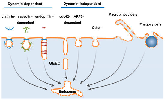 Examples of the main endocytosis pathways. GEEC—glycosylphosphatidylinositol-anchored protein-enriched compartment.