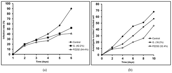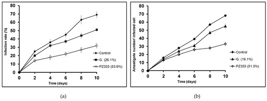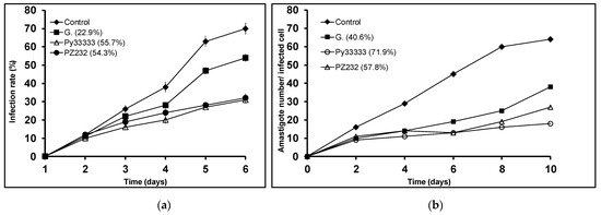 Following a similar method as the described one in the amastigote experiment, macrophages were harvested and infected with promastigotes in their stationary phase. The test dosage was IC25 for this experiment. The coverslips were collected every 2 days for 10 days and counted in order to determine if drugs affected promastigote infection and amastigote division within the cells by measuring the infection rate (percentage of infected cells) and amastigote number per infected cell [10].