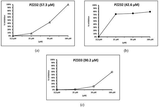 Fe-SOD activity inhibition percentages for L. infantum (a), L. braziliensis (b), and L. donovani (c). Drug IC50 for enzymatic activity is displayed in parenthesis. Note: only results for one compound are displayed for L. infantum, as the other active one (Py33333) showed no inhibition in parasitic Fe-SOD.