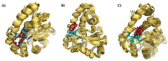 Superimposition of the 10 minimum energy conformers of the interaction between Py33333 (A), PZ232 (B), and PZ333 (C) with Fe-SOD.
