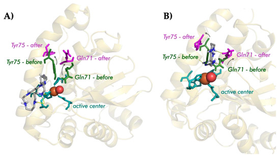 The analysis of the interaction of the pyrazole macrocycles with FeSOD shows a similar behavior for both of them. In the minimum energy conformers, both pyrazole ligands are located between the residues glutamine 71 and tyrosine 75, blocking access to the funnel of the active center of the enzyme, and disrupting its hydrogen bond network. Moreover, the ligands tend to interact with histidines 31 and 164 of the active center of the Fe-SOD enzyme using one of its protonated amino groups.