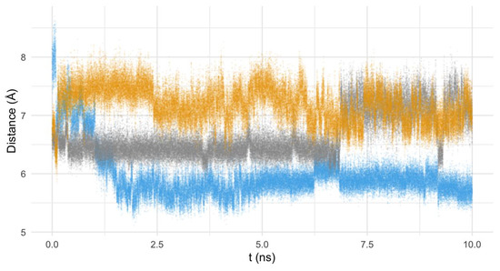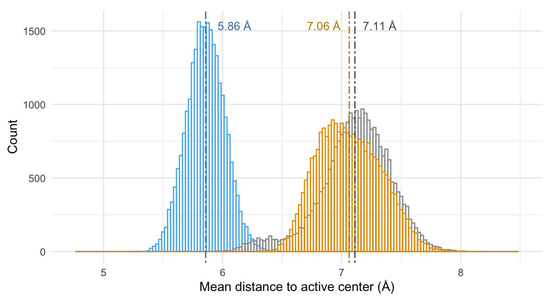 The similar interaction mode of both pyrazole ligands and the divergence of the pyridine behavior of the pyridine macrocycle are also consistent in time (and not only in the structure of the minimum energy conformers), as evidenced by the analysis of the mean distance of the molecule to the active center of the enzyme along the theoretical simulation (see Figure 10 and Figure 11). Figure 10 shows the mean distance of the macrocycles to the active center of the enzyme during the 10 ns modeling, while the histogram of the distances to the active center for the last 2.5 ns has been represented in Figure 11.