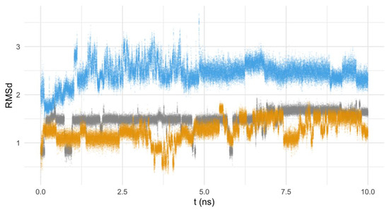 RMSd of Py33333 (in blue), PZ232 (gray), and PZ333 (yellow) in the function of the time of calculation (ns).
