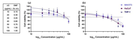 Cell viability of NIH/ 3T3, HaCaT and THP-1 cells after treatment with DMF for 24 (a) and 48 h (b). The corresponding concentrations (% v/v) of the solvent DMF with cG’s doses are being depicted in the table on the left.