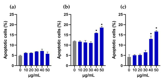 Percentage of apoptotic cell population after treatment with increasing doses of DMF for 24 h in NIH/3T3 (a), HaCaT (b) and THP-1 cells (c). DMF’s toxicity was tested at a range of 0.15% v/v to 0.75% v/v which is equal to treatment of 10 μg/mL to 50 μg/mL of cG. * Statistically significant difference from control (p < 0.05).