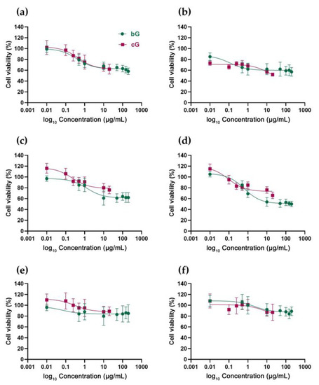 Overall, apart from THP-1 macrophages, where no toxicity was reported, both bG and cG acted similarly in NIH/3T3 and HaCaT cells, resulting in a 50% decline in viability at their maximum doses at 48 h. Nevertheless, it is important to note again that the maximum tested dose of bG (200 μg/mL) was 10 times higher than that of cG (20 μg/mL).