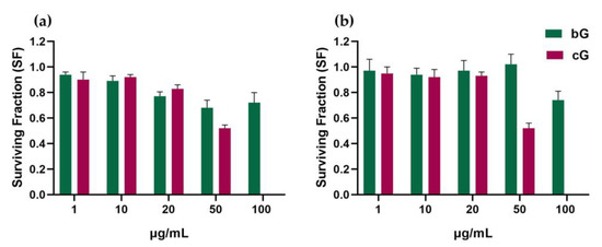 Only the highest dose of 100 μg/mL of bG affected HaCaT cells’ ability to form colonies as the surviving fraction was stable at 0.9–1 for the doses of 1 to 50 μg/mL and then dropped at 0.7 at the dose of 100 μg/mL. Doses of 1–20 μg/mL of cG also did not lead to a reduced formation of colonies compared to the control, but at the dose of 50 μg/mL, there was a significant drop in the surviving fraction, from 0.9 to 0.5. (Figure 4b). Representative images of NIH/3T3 and HaCaT colony forming efficiency after treatment with 20 μg/mL of either bG or cG for 48 h are available in Supplementary Figure S5.
