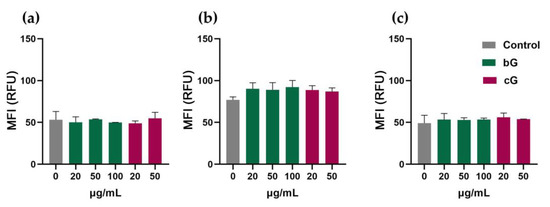ROS formation after treatment of cells with three doses of bG (20, 50 and 100 μg/mL) or two doses of cG (20 and 50 μg/mL) for 24 h in NIH/3T3 (a), HaCaT (b) and THP-1 cells (c). MFI, mean fluorescence intensity. RFU, relative fluorescence units.