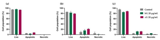 Depiction of the live, apoptotic, and necrotic cell population (%) in NIH/3T3 (a), HaCaT (b) and THP-1 cells (c) after treatment with 20 μg/mL of either bG or cG, for 24 h.