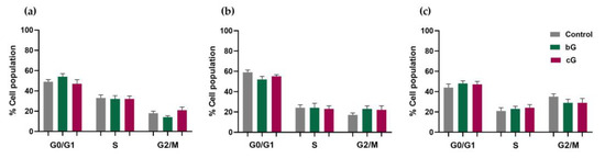 In NIH/3T3 cells, the treatment with 20 μg/mL of bG induced a non-significant increase in the G0/G1 phase compared to the control (control: 49 ± 2.1%, bG: 54 ± 3%), combined with a small drop in the G2/M phase (control: 18 ± 2%, bG: 14 ± 1.5%). The treatment with 20 μg/mL of cG induces a 3% increase in the G2/M phase (Figure 7a). In untreated HaCaT cells, 17 ± 2% of the population was in the G2/M phase and treatment with either of the nanomaterials induced a slight arrest in the G2/M phase, with percentages of 23 ± 3% and 22 ± 4% for bG and cG, respectively (Figure 7b). Finally, 20 μg/mL of bG in THP-1-derived macrophages elicited a minor decrease in the G2/M phase (control: 35 ± 2.9%, bG: 29 ± 3.5%) and an increase in the S phase (control: 21 ± 3.1%, bG: 23 ± 2.60%). cG had the same effect in the cell population as 29 ± 4.30% of cells were in the G2/M phase and 24 ± 3.2% in the S phase (Figure 7c).