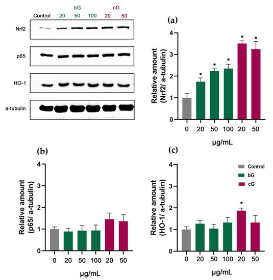 Relative amount of Nrf2 (a), p65 (b) and HO-1 (c) in HaCaT cells after treatment with increasing doses of either bG or cG for 24 h. * Statistically significant difference from control (p < 0.05).