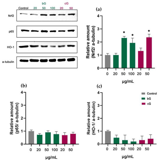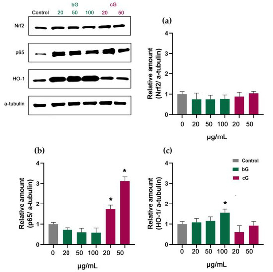 In HaCaT cells, treatments with 50 and 100 μg/mL of bG doubled the expression of Nrf2 protein (about 1-fold change). The treatment with 50 μg/mL of cG had the same effect (Figure 9a). This increase was not combined with an increase in HO-1’s expression (Figure 9c). The relative amount of p65 remained unchanged in treated cells (Figure 9b).
