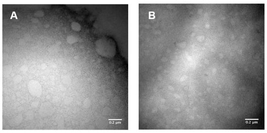 Although differences in the size and the organization of phospholipids at the oil–water interface may be possible, Nano-1 and Nano-2 were stable at room temperature and in preliminary thermal and mechanical stress tests (Supplementary Material, Table S3). When submitted to the drying process for TEM analysis (Figure 1), however, an increase in the size of the droplets was observed when compared with DLS measurements. This increase can probably be due to the evaporation of the external aqueous phase of the nanoemulsions, which can result in the rearrangement of the emulsifiers at the interface and the droplet coalescence as observed in the TEM images. Still, the morphology of the particles could be determined by TEM.