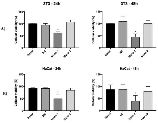 The viability of fibroblasts and keratinocytes in contact with nanoemulsions was evaluated with the MTT colorimetric method [18,19]. In general, cells were plated in 96-well plates at 4.0 × 103 cells/well in a DMEM culture medium, incubated for 24 h at 37 °C in an incubator with 5% CO2. After this period, the same volume of 200 μL, but with different concentrations of Nano-1, Nano-2, and NC, ranging from 1.0 × 1012 to 2.5 × 1011 particles/mL, was added to the culture medium and incubated for 24 h and 48 h before MTT analysis. Controls were performed without formulations to verify any interference in the colorimetric analysis.