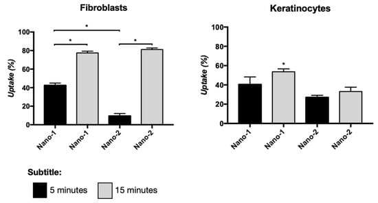 Cellular uptake of Nano-1 and Nano-2, at a concentration of 1011 particles/mL, after 5 and 15 min of contact with a monolayer of fibroblasts and keratinocytes. Results were statistically analyzed using ANOVA, followed by Tukey’s test. (*) indicates statistically significant difference with P < 0.05 (n = 3 determinations).