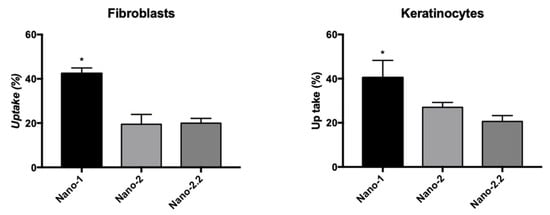 Cellular uptake of Nano-1 and Nano-2 compared to Nano-2.2, with nanoparticle size similar to that of Nano-1, after 5 min of contact with a monolayer of fibroblasts and keratinocytes. Results were statistically analyzed by ANOVA analysis of variance, followed by Tukey’s test. (*) indicates statistically significant difference with P < 0.05 (n = 3 determinations).