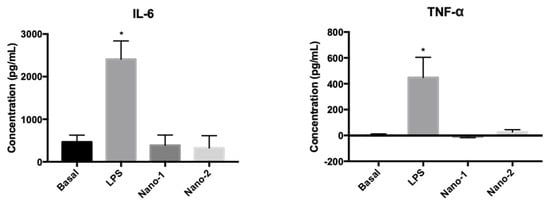 The macrophage culture was treated with nanoemulsions at a concentration of approximately 3 × 1011 particles/mL, diluted in the culture medium. As a positive control, the inflammatory state of macrophages was induced by incubating the cells with 10 ng/mL of bacterial LPS [21]. After the treatments, the cells were incubated for 24 h at 37 °C and 5% CO2. IL-6 and TNF-α production was evaluated by ELISA, using the Multi-Analyte Elisa Array Kit.