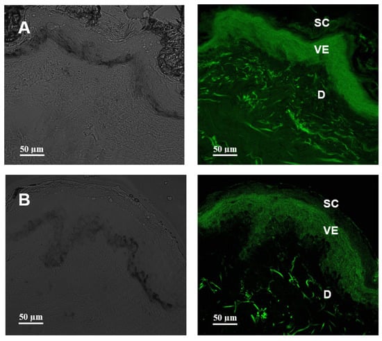 Franz-type vertical diffusion cells were used for the penetration test. The volume of the receptor solution was 16 mL. The penetration area was 0.95 cm2, and 1 mL of each tested formulation was used. The experiments were performed at room temperature (25 °C). Human skin fragments from abdominoplasty were used as the membrane (CEP/FCFRP protocol nº. 506—CAAE: 11726919.0.0000.5403, CEP report nº 3,712,502). The fragments of subcutaneous tissue were discarded to preserve the dermis and epidermis, and the skin fragments were stored at −20 °C until use. Immediately before the penetration experiments, the fragments were removed from the freezer and defrosted. The vertical diffusion cell was built with the skin positioned between the donor and recipient compartments, with the stratum corneum facing the donor. The donor was filled with 1 mL of Nano-1 and Nano-2. Preparations were labeled with 1 mg/mL of BODIPY. In contact with the dermis, the receptor compartment was filled with isotonic phosphate-saline buffer at 10 mmol/L pH 7.4 (PBS). After 1 h of contact with the skin, the formulation was removed, and its excess was washed off in PBS. Then, the skin fragments were frozen at −80 °C in Tissue Tek, cut to a thickness of 20 µm in a Cryostat (Leica CM1860, Germany), placed on glass slides and coverslips, fixed with Fluoromount, and analyzed in confocal laser scanning microscope (Leica SP8, Germany) at λexc = 470 nm and λem = 512 nm with a 20× objective.