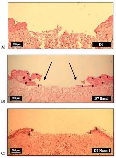 A set of experiments were then performed to evaluate the formulations’ influence on the kinetics of ulcer closure by treating the skin fragments with the Nano-1, Nano-2, and NC formulations at a concentration of 3.2 × 1011 particles/mL daily for 7 days. The culture medium was changed every 3 days, and the tests were performed in triplicate. After the treatment, the explants were collected, fixed in formalin, embedded in paraffin, and stained for histological and immunohistochemical analysis [23].