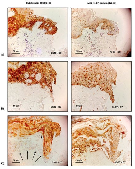 The potential of the formulations for treating cutaneous wounds was investigated in an induced-wound model in human skin explants. The influence of the density of nanoparticles added to the induced ulcer was initially evaluated to validate the model. Figure 9 clearly shows that the high density of oily nanodroplets (internal phase of the nanoemulsions) impaired wound closure in the ex vivo model. This impediment, however, was not related to the toxicity of the formulations since the expression of differentiating (Ck10) and proliferating cells (Ki-67) could be observed at the lesions’ edges (Figure 8), even when the nanoemulsion was applied without previous dilution.