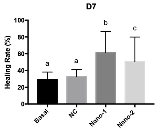 Graphic representation of the healing rates for human skin fragments treated daily for 7 days with culture medium (Basal), and 3.2 × 1011 particles/mL of mineral oil control nanoemulsion (NC), Nano-1, and Nano-2. Results were statistically analyzed by ANOVA, followed by Tukey’s test. Different letters indicate statistically significant differences with P < 0.05 (n = 3 determinations).
