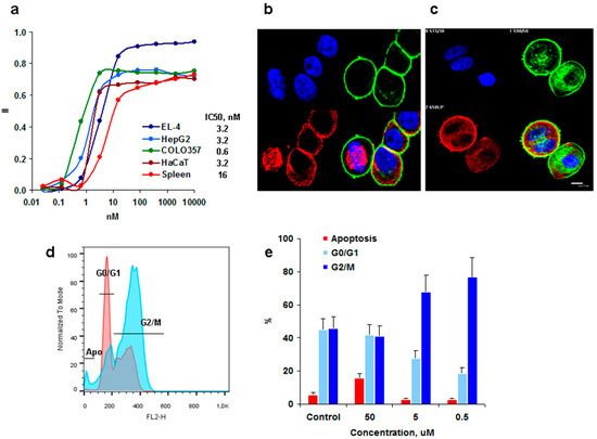 Functional characteristics of 9E: (a) Antiproliferative activity of 9E against EL-4, HepG2, COLO357 and HaCaT cell lines and against normal mitogen activated splenocytes (spleen); the IC50 of the corresponding cells is shown on the right side. SD were around 5–15%, and are not shown for a better visualization. (b,c) Confocal microscopy analysis of β-tubulin (red) and F-actin (green) staining of K562 cells without (b) and with 500 nM of 9E. (c) Nuclei are stained with Hoechst 33342 (blue). Scale bar 15 µm. (d,e) Cell cycle analysis of K562 cells in control ((d), pink histogram) and after 48 h incubation with 500 nM of 9E ((d), blue histogram) and dose-dependent distribution of cell cycle phases. G2/M—cells with doubled DNA; G0/G1—nonproliferating cells with single DNA; Apo—apoptotic cells.