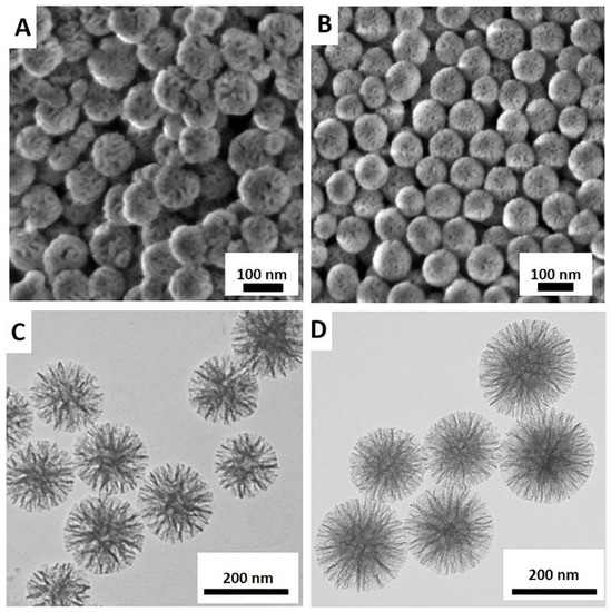 Scanning electron microscopy (SEM) and transmission electron microscopy (TEM) images of MSN (A,C) and MON (B,D).