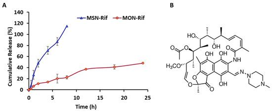 Cumulative release of Rif (A) from MSN-Rif and MON-Rif conducted in PBS at 37 °C for 24 h. Data are represented as the mean ± SD (n = 3) and rifampicin structure (B).