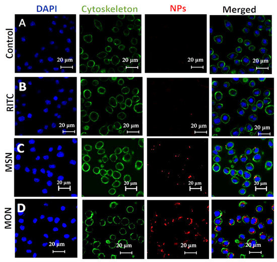 Confocal scanning laser microscopy images of RAW 264.7 cells after 4 h incubation in complete medium. (A) Control with no treatment to cells, (B) cells that were treated only with RITC, (C) cells that were treated with MSN loaded with RITC, and (D) cells that were treated with MON loaded with RITC. Nuclei were stained with DAPI (blue), the cellular cytoskeleton was stained with Phalloidin Alexa Fluor 488 dye (green) and the nanoparticles were stained with RITC (red). The control group was treated only with medium whereas all the other groups were treated with the same concentration of the RITC.