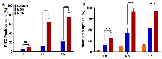(A) Cellular uptake of MSN and MON loaded with RITC in RAW264.7 cells measured with flow cytometry at 37 °C. (B) Rifampicin uptake by RAW 264.7 cells; Rifampicin solution (orange bar), MSN-Rif nanoparticles (blue bar) and MON-Rif nanoparticles (red bar), when dosed at a rifampicin concentration of 50 μg/mL (mean ± SD, n = 3, ns = not significant; **** p < 0.0001).