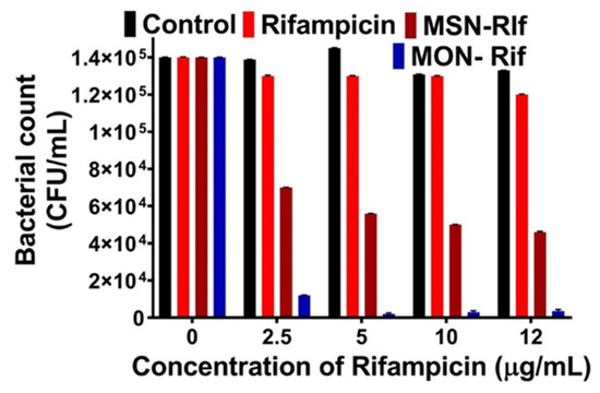 An intracellular infection assay was achieved according to the method of Clemens et al. [12], with slight modifications. Briefly, RAW 264.7 cells (1 × 105 cells/mL) were seeded in a 24 well plate and incubated for 24 h (37 °C, 5% CO2). SCV SA bacterial suspension was diluted to a multiplicity of infection of 10:1 from the overnight culture. Following centrifugation (600× g for 10 min) of the bacterial suspension, the supernatant was discarded, and the pellet redispersed in DMEM. After 1 h incubation, the cells were rinsed three times to remove any extracellular bacteria. Infected cells were then incubated for 4 h with 1 mL of fresh serum-free DMEM containing either Rif, MSN-Rif, or MON-Rif at a Rif concentration of either 2.5, 5 10, or 12 μg/mL. The media were removed and the cells lysed with 0.1% Triton-X 100 in PBS. The cells were transferred to Eppendorf tubes, serially diluted, and plated on sterile TSA followed by 15 h of incubation at 37 °C. After 15 h, the colony forming units (CFU)/mL were determined.