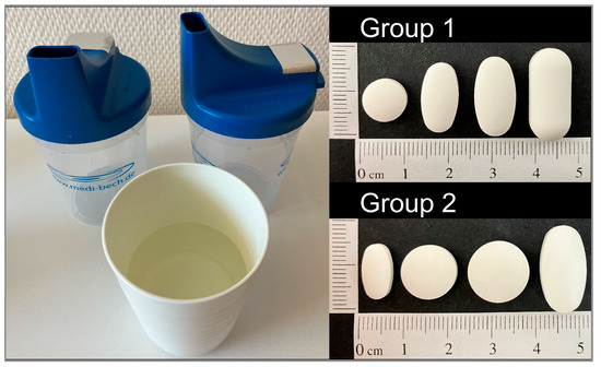 Participants were asked to refrain from taking any medication, drinking, and eating up to one hour before the start of the assessment. Depending on the group assignment, participants were asked to swallow the same four tablets in a randomized order on three study days (Figure 1). Participants in Group 1 swallowed a 250 mg round, a 500 mg as well as a 750 mg oval, and a 1000 mg oblong tablet. Participants in Group 2 swallowed a 250 mg oval, a 500 mg as well as a 750 mg round, and a 1000 mg oval tablet. A time span of five minutes was kept between the deglutition of each of the four tablets. Tablets were provided to the participants in a Medi-Bech (Heller-Planung-Projektierung, Sankt Wolfgang, Germany), placed in the lid, on which the back hole was covered with aluminum foil (Figure 1). This blinding procedure ensured that participants did not see the tablets before swallowing them. In addition, a cup with 100 mL tap water at room temperature was provided. Participants were allowed to drink water ad libitum (max. 100 mL per tablet) and were asked to swallow the tablets in an upright position within one minute. If participants were not able to swallow any of the tablets, they were allowed to spit them out.