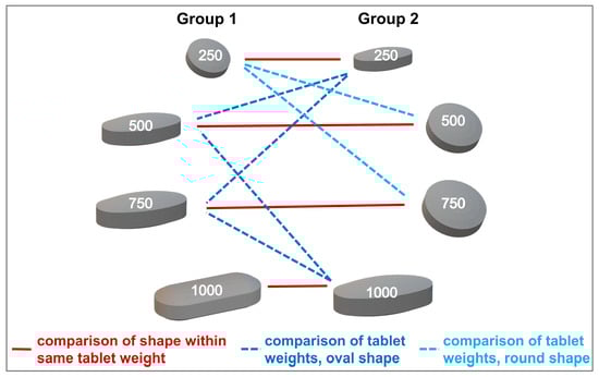 Fisher’s exact test was used to compare binary swallowability ratings of different tablets within the same age category and to test the influence of age on the rating of tablets’ swallowability. For comparisons within the same age category, only tablets from the two different experimental groups (Group 1 or Group 2) were compared to each other in order to ensure comparison of independent data. The statistical test was done for tablets of same weight but differing in shape, and for tablets of same shape but differing in weight (Figure 2). To control the false discovery rate and account for multiple testing, p-values were corrected according to Benjamini and Hochberg [32]. If any adjusted p-values within a group of comparisons were <0.05, confidence intervals were also adjusted as proposed by Benjamini et al. [33]. In general, a p-value of <0.05 was deemed significant. Results are presented as p-values and odds ratios with their corresponding upper and lower confidence interval, CI, boundaries.