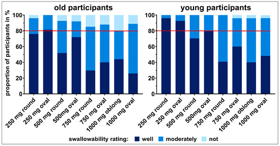Summary of swallowability ratings (not swallowable, moderately swallowable, and well swallowable) for each of the tablets tested in old and young participants. The rating of each participant comprises the swallowability evaluations of three study days. Taking the ratings not and moderately swallowable together and comparing those to the ratings well swallowable allows for a strict qualitative swallowability assessment. However, when taking the two ratings well and moderately swallowable together and comparing to the rating not swallowable, swallowability capabilities can be evaluated. The red line represents 80% of participants.