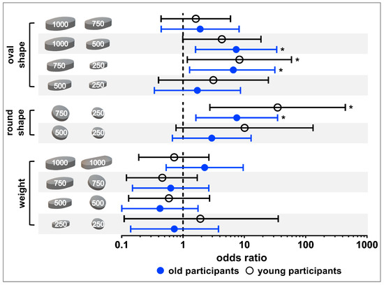 Statistical analysis of tablet ratings categorized as well swallowable vs. not/moderately swallowable using the Fisher’s exact test and applying Benjamini Hochberg correction. Results for old participants are shown in blue, while those for young participants are shown in black. Dots and circles are representing odds ratios and bars are marking the upper and lower confidence interval boundaries (98.5% confidence interval for old participants and 98.0% confidence interval for young participants). Asterisks indicate significant difference.