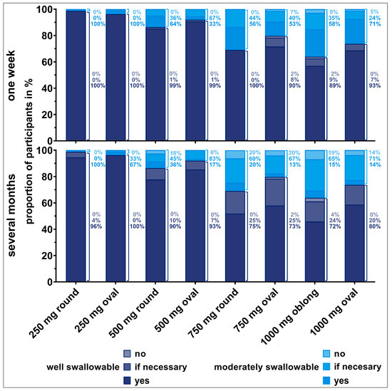 Over 80% of old participants who rated the 250 mg round and oval tablets as well swallowable were willing to take those tablets daily over several months. However, willingness was limited for tablets exceeding a weight of 250 mg, even if they were rated as well swallowable. Young participants were willing to take tablets up to 500 mg of weight daily over several months in cases they were rated as well swallowable. Young participants’ willingness was slightly reduced for tablets of 750 mg or higher weight, even if rated as well swallowable. If tablets’ swallowability was rated as moderate, over 80% of young participants would be willing to take those tablets daily for a long-term treatment. However, some of those young participants would only be willing if the intake was really necessary.